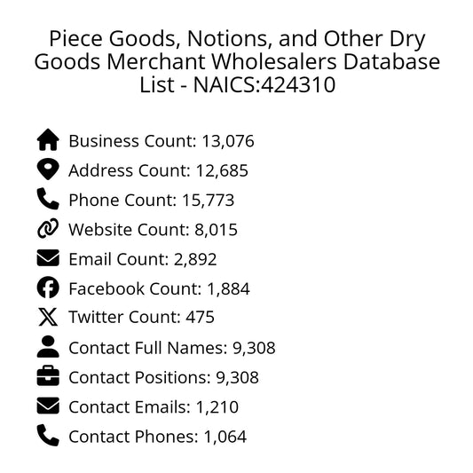 Piece Goods, Notions, and Other Dry Goods Merchant Wholesalers Database List - NAICS:424310