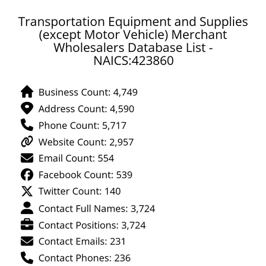 Transportation Equipment and Supplies (except Motor Vehicle) Merchant Wholesalers Database List - NAICS:423860